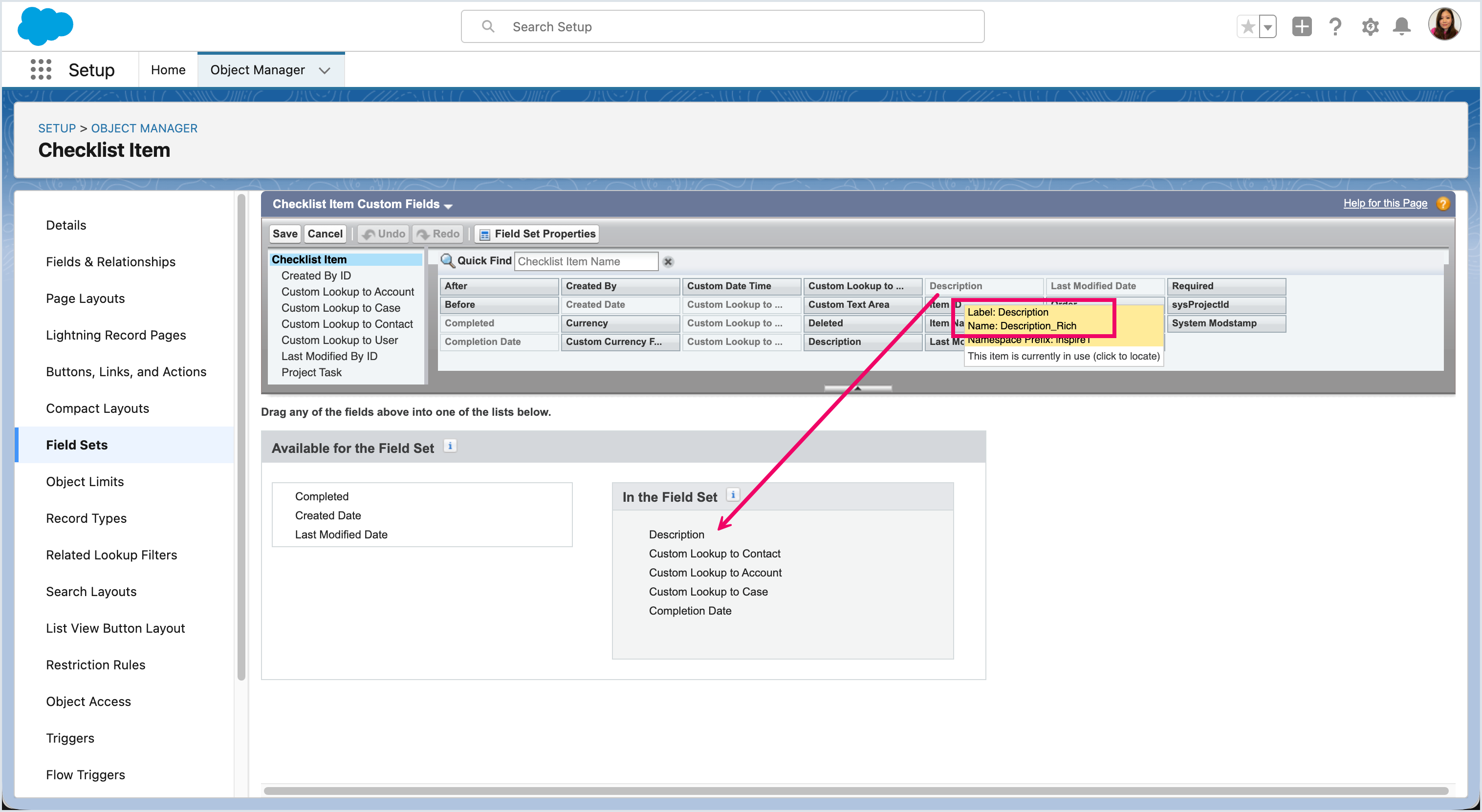 The next step is to add the Rich Text Description field to the Checklist Item field set so that it displays as a column in the Checklist Item component.