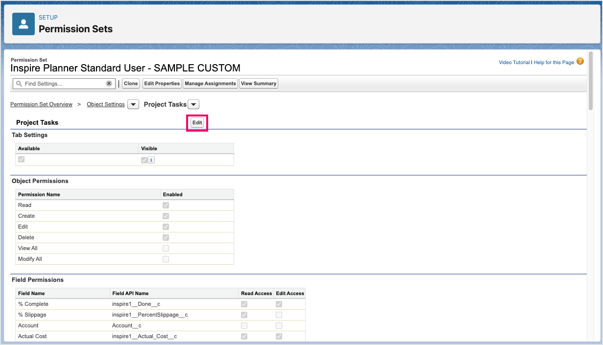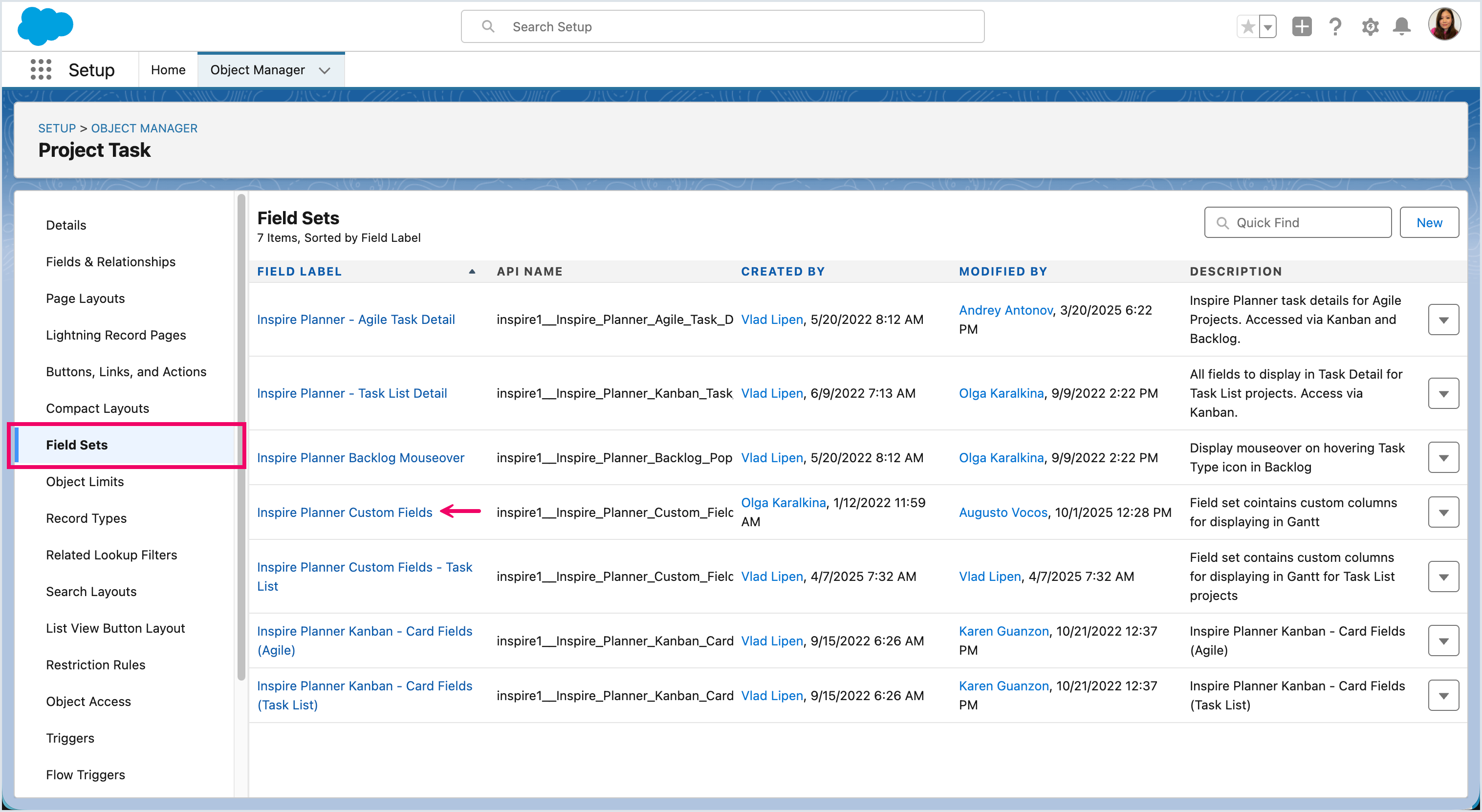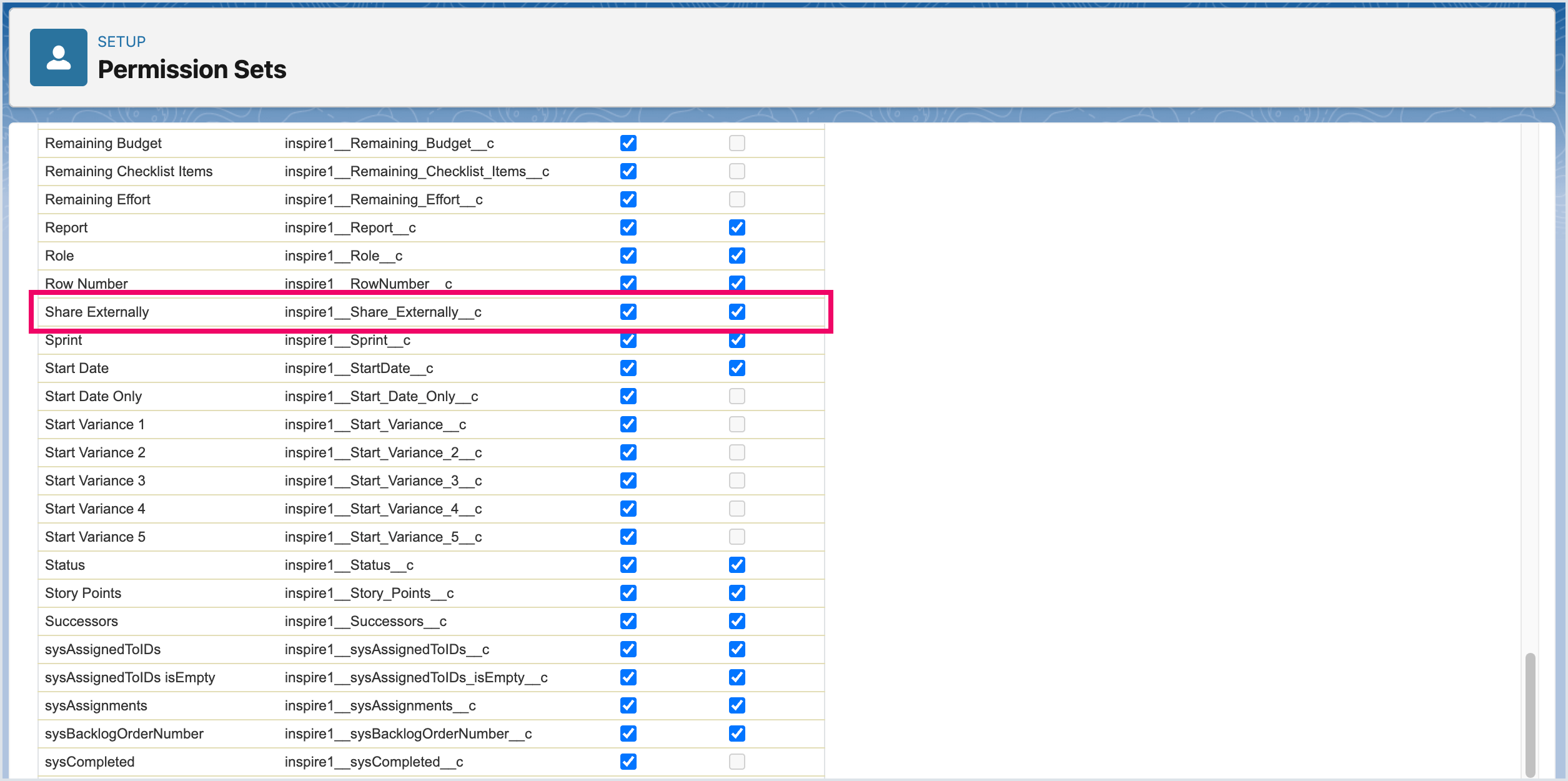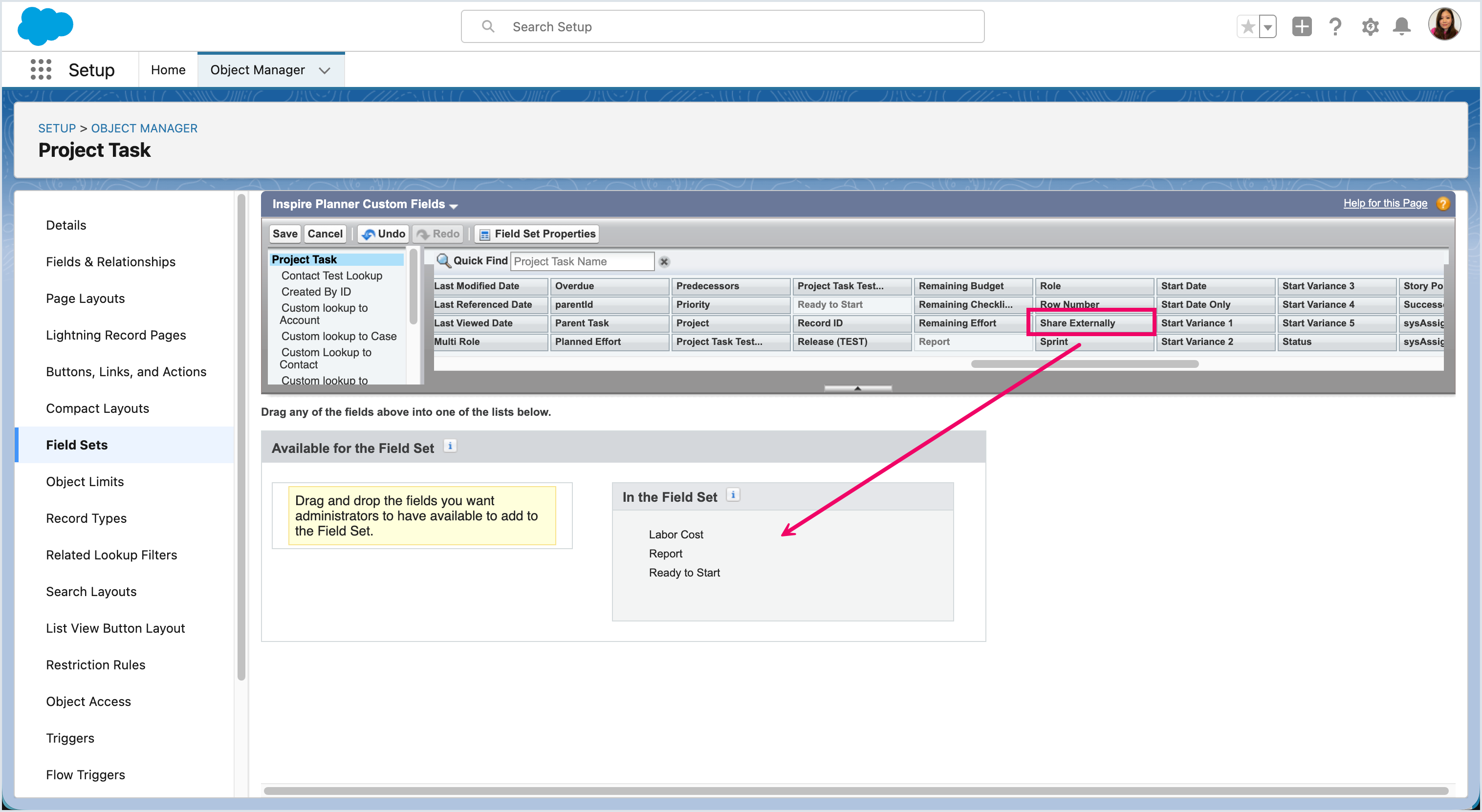 The next step is to add the Share Externally Field to the Inspire Planner Custom Fields field set so that it appears as a column option in the Project Gantt.
