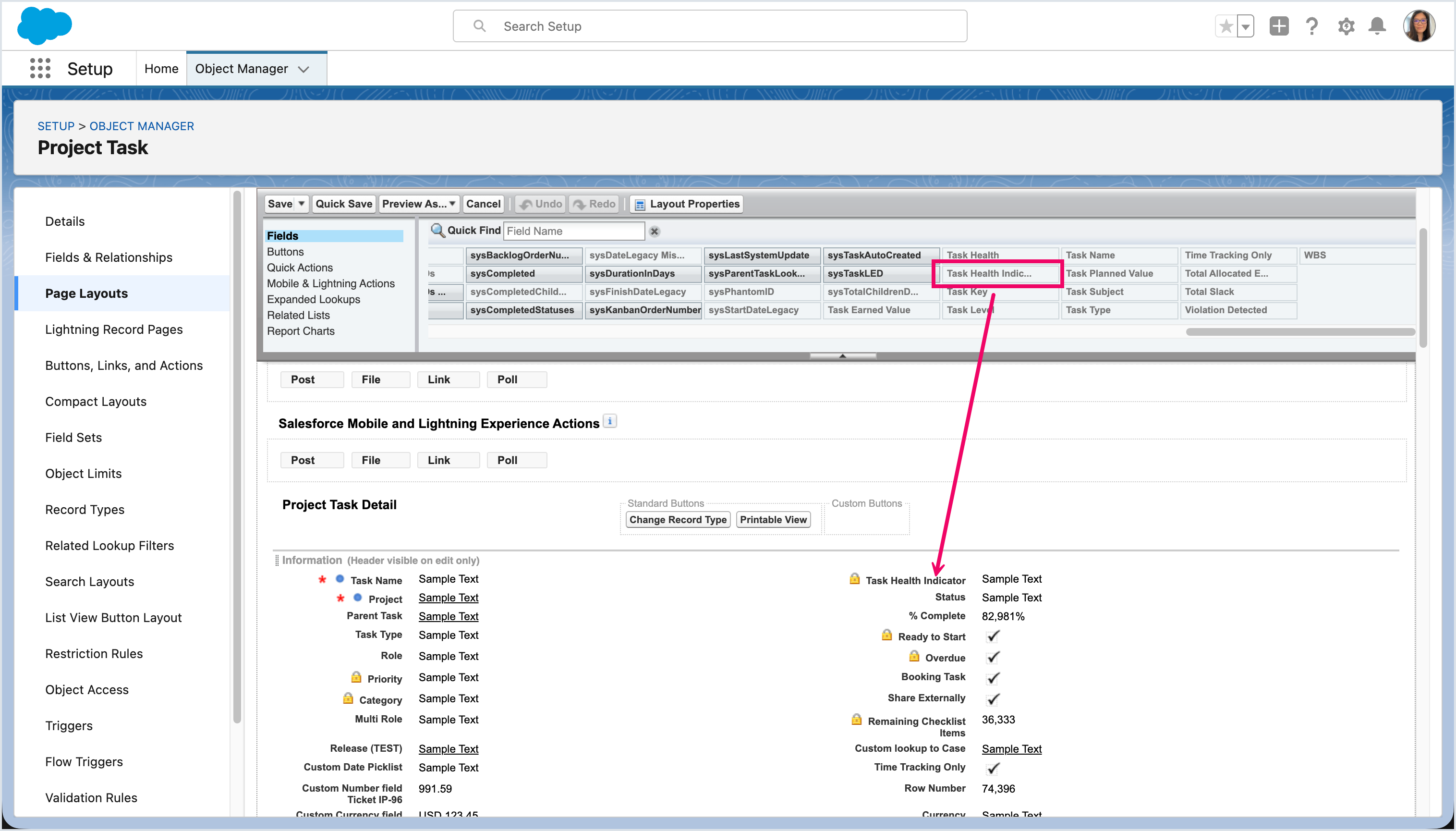 The next step is to add the Task Health Indicator field to the project task page layout.
