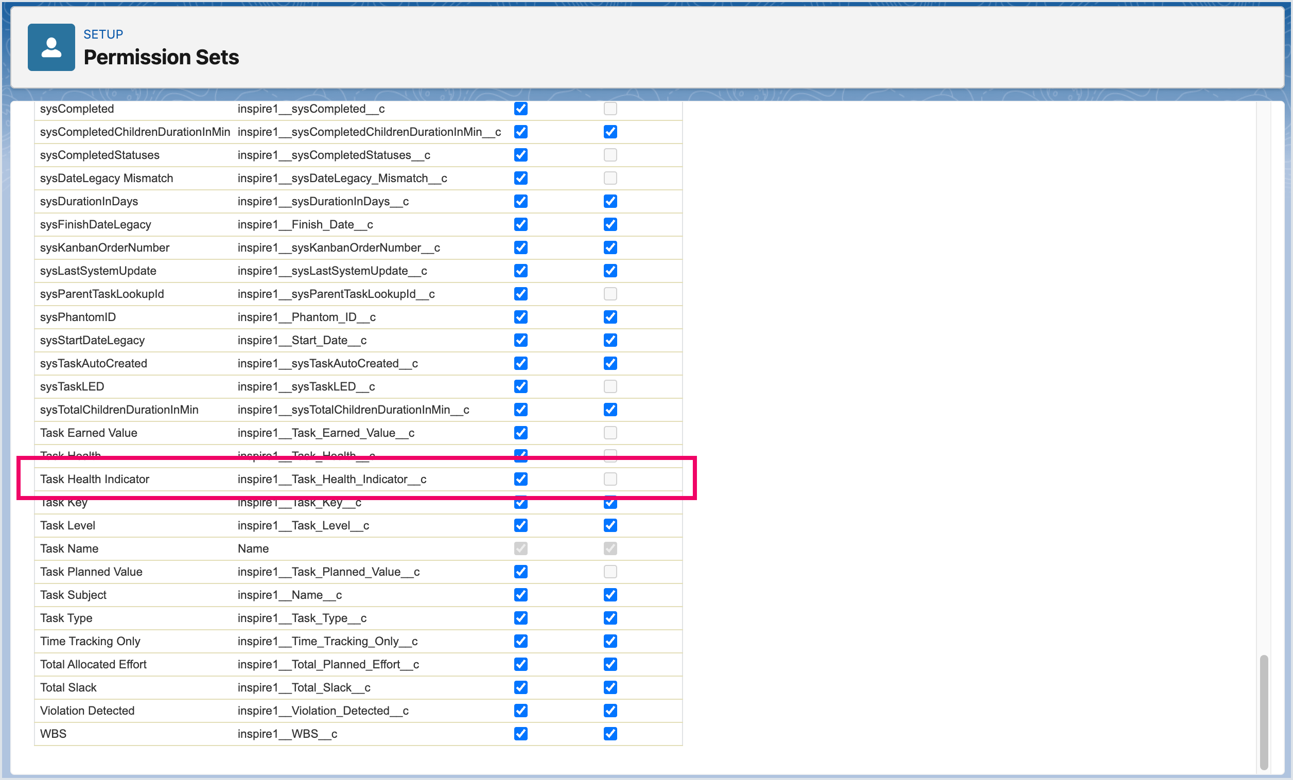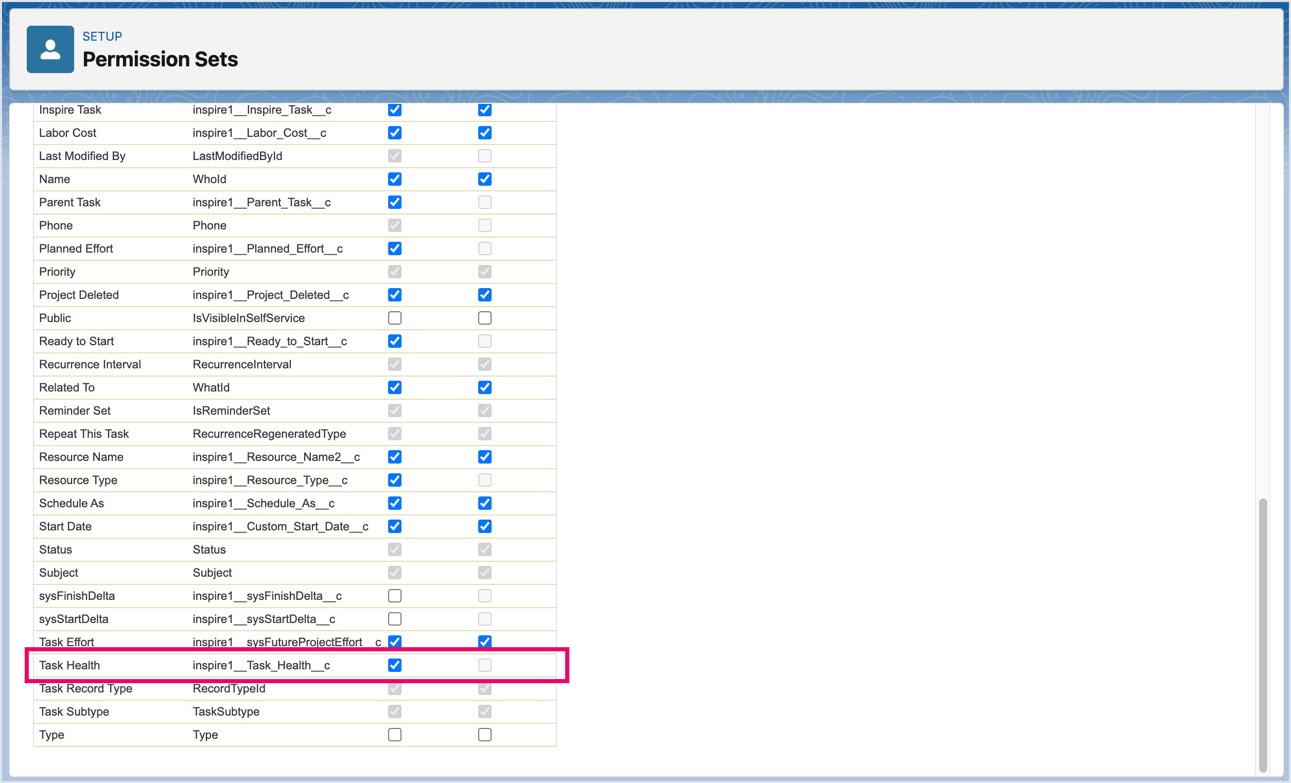 Start by granting access to the Task Health Indicator field in the Project Task object.