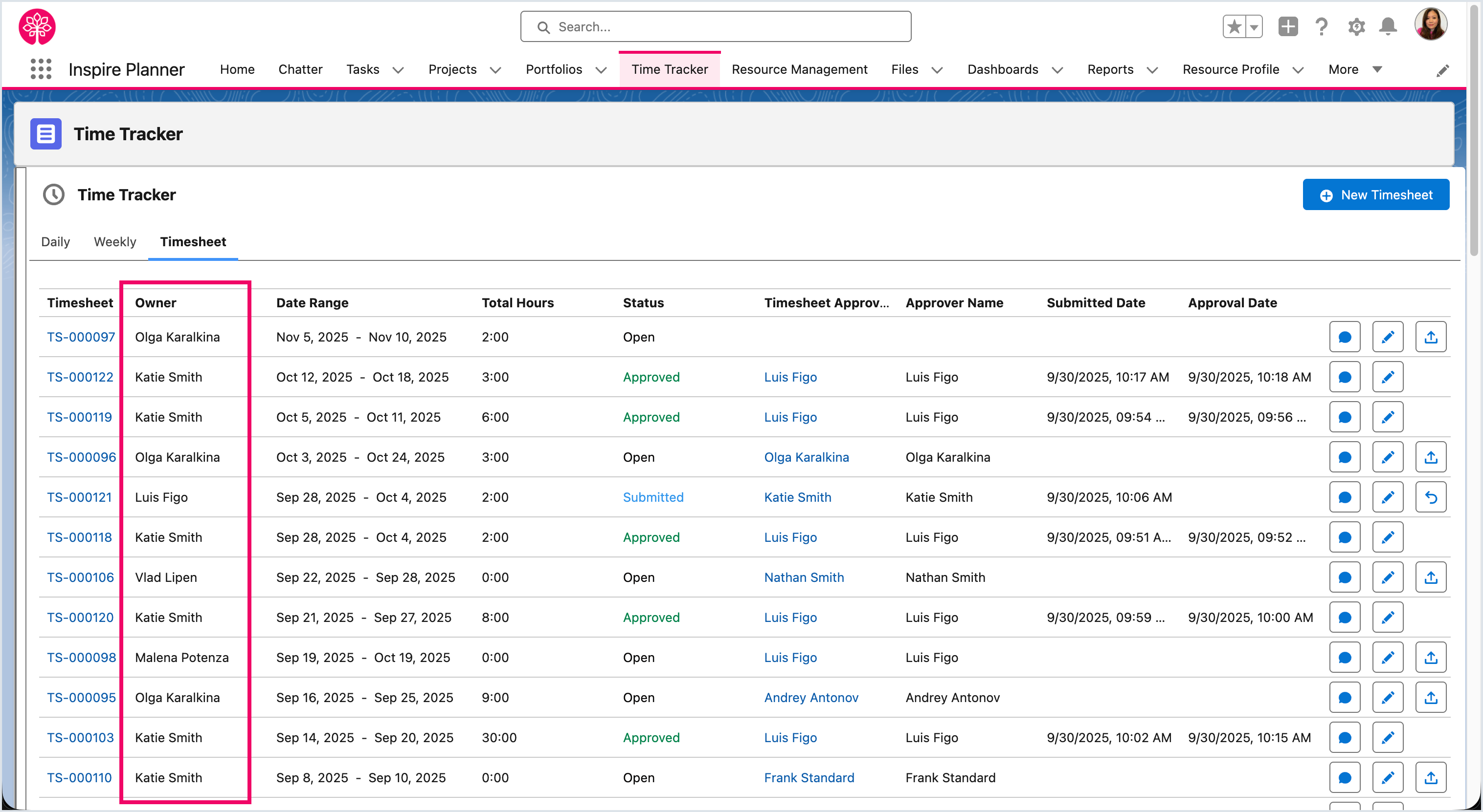 As a Timesheet Manager, when you go to the Timesheet Tab in Time Tracker, you see all timesheets. The 'Owner' column tells you who the timesheet belongs to. From here, you can edit, submit or recall timesheets.