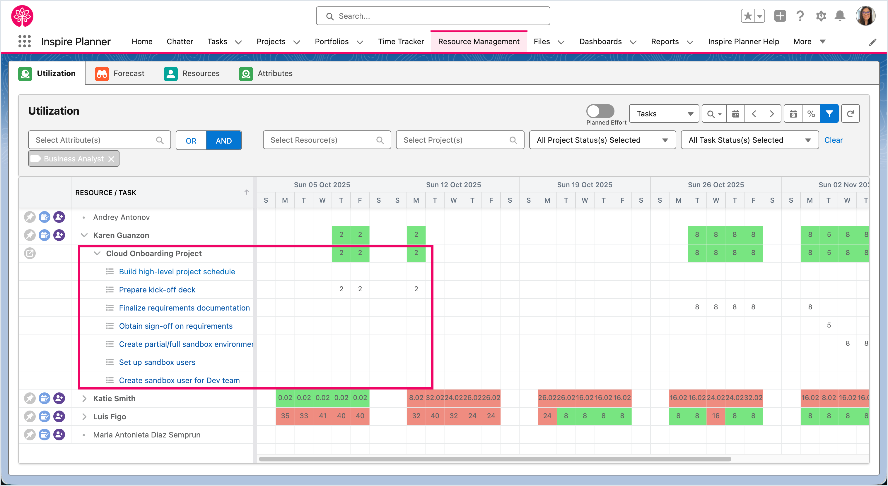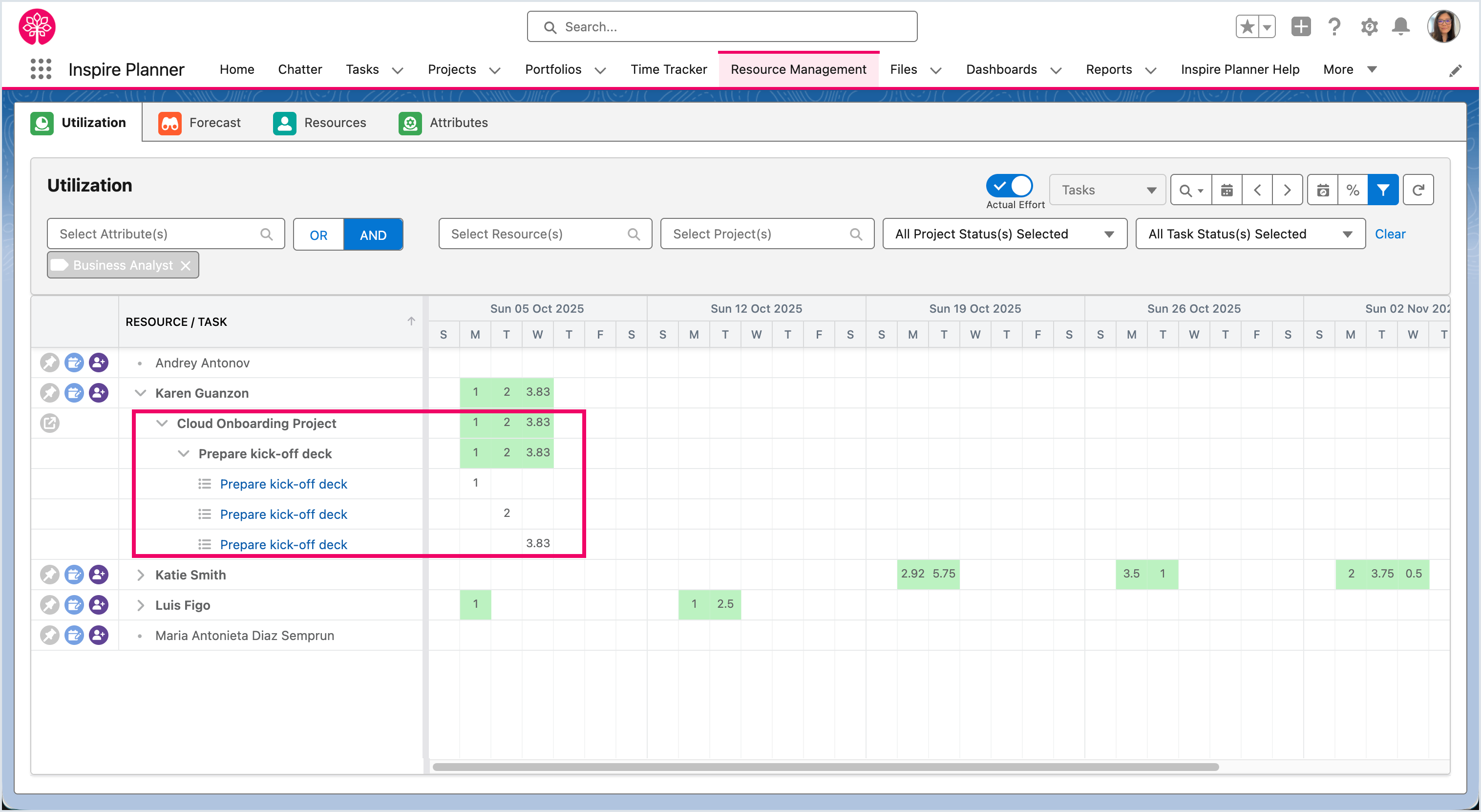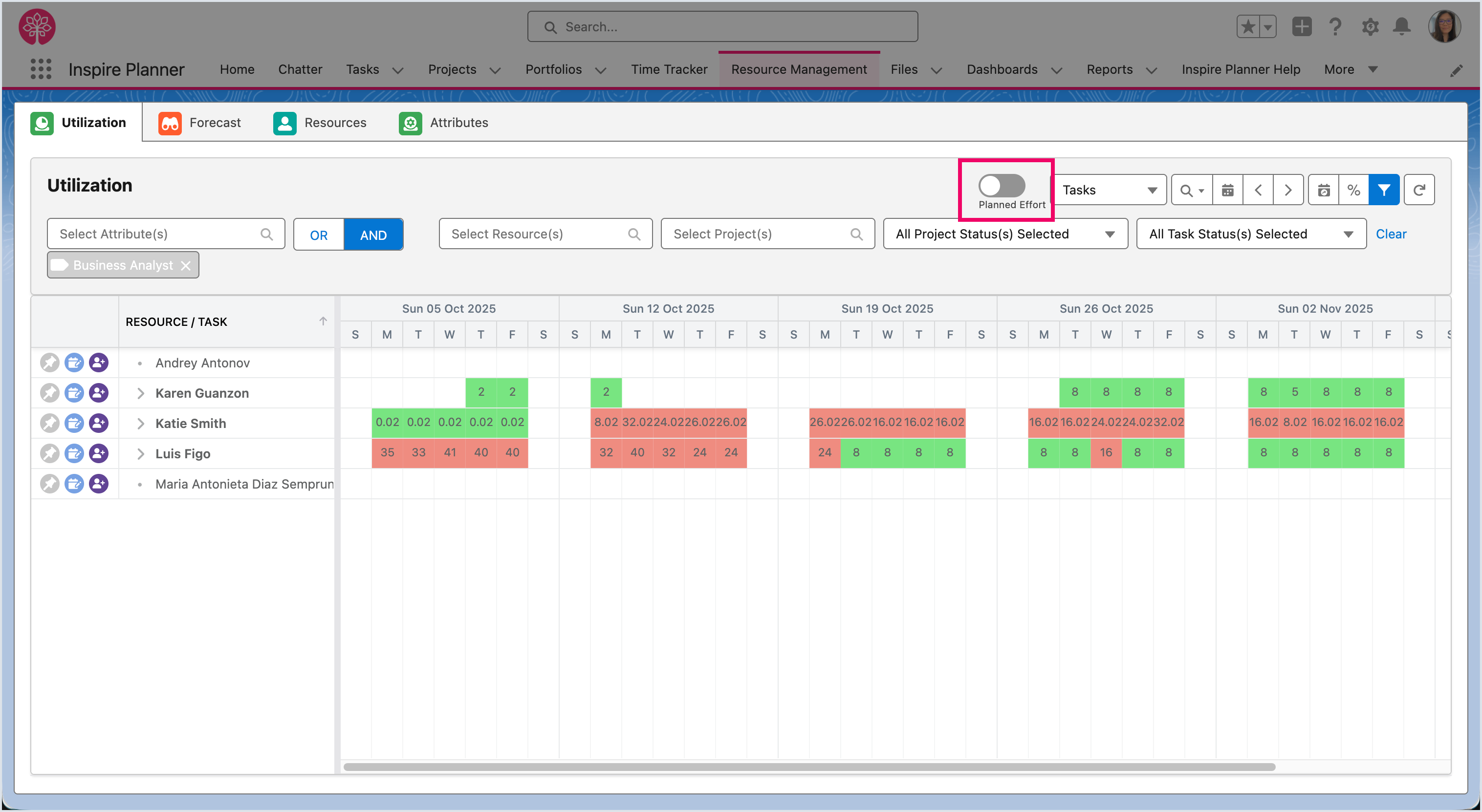 When viewing Actual Effort, you’ll only see time entries you have permission to access. To view all time entries, assign the Inspire Planner – Resource Manager permission set to the user.
